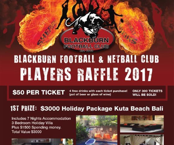 1st Prize is a $3,000 Holiday Package at Kuta Beach Bali. Download DL Raffle Flyer Below. Blackburn Football & Netball Players 2017 Raffle